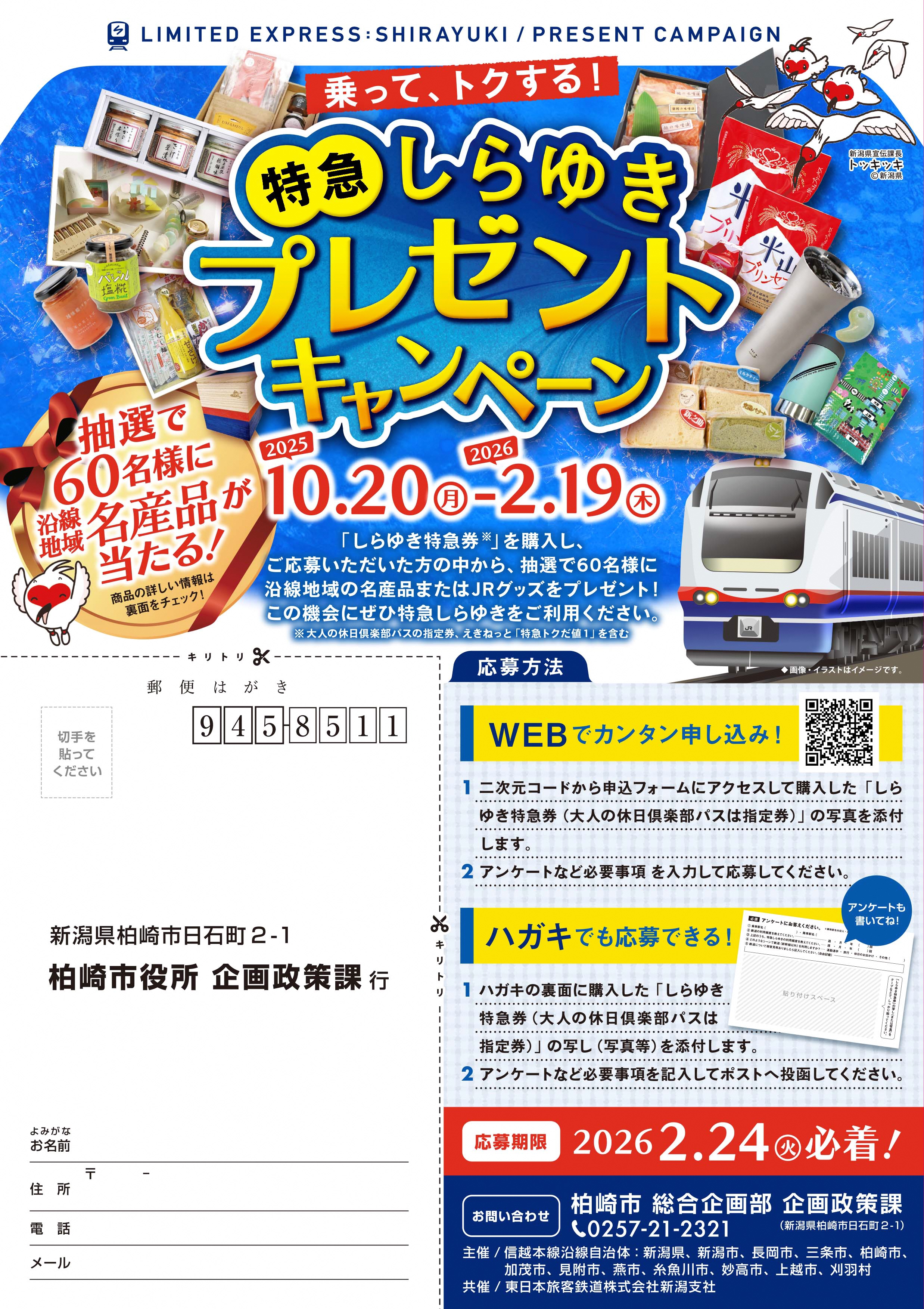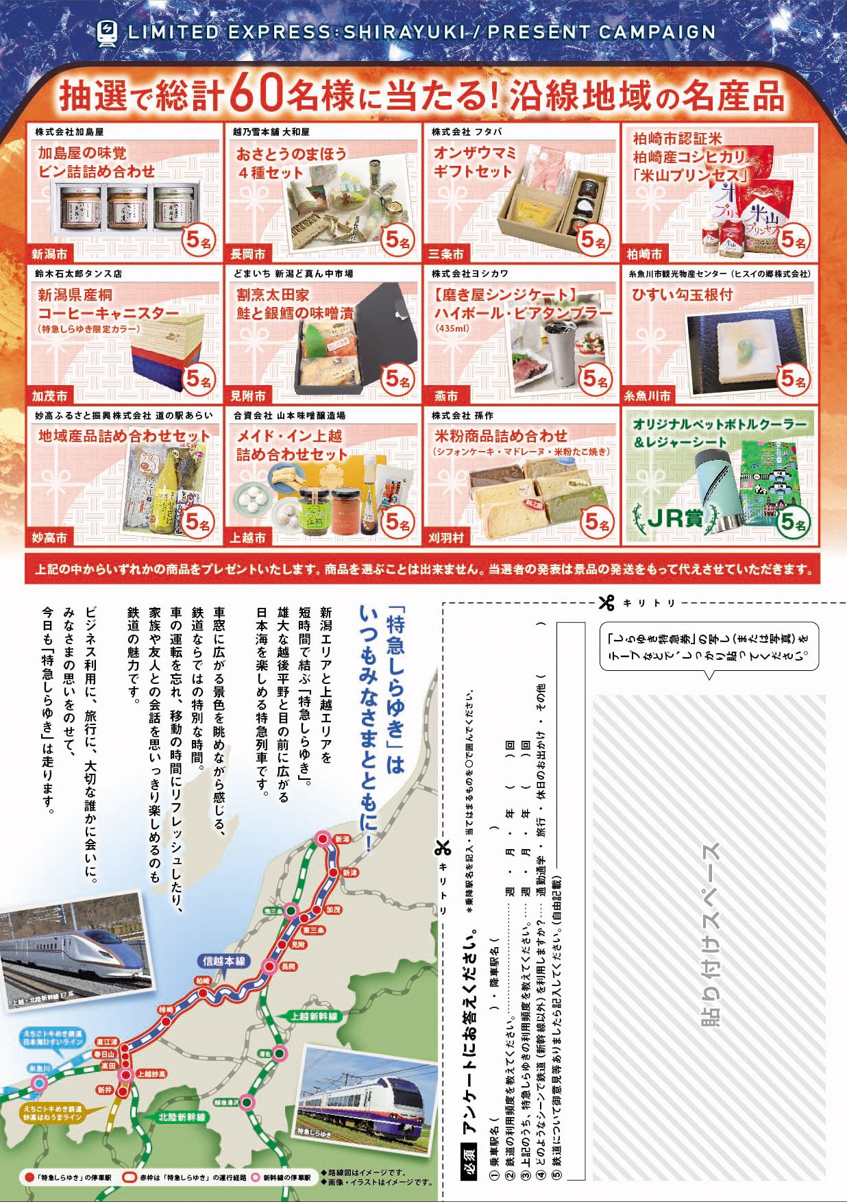 ・応募は、「特急しらゆき特急券」1枚につき 1回のみとします。 ・複数回購入された場合は、購入した特急しらゆき特急券の数だけ応募できます。 ・当選者は、景品の発送をもって代えさせていただきます。 |
