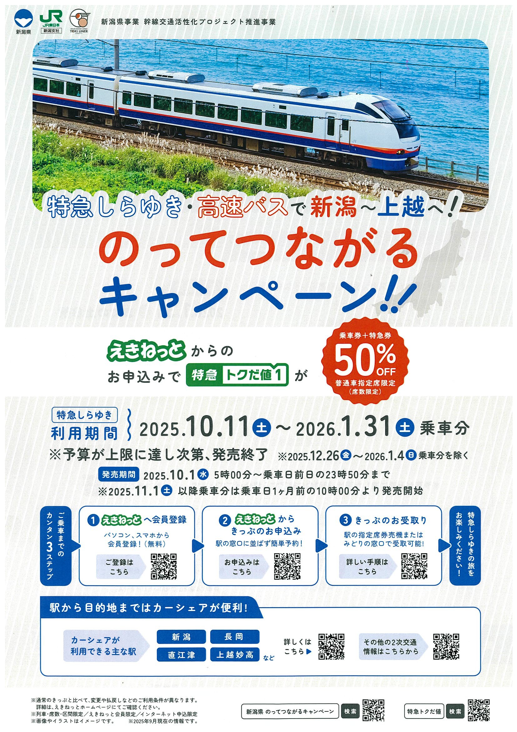 JR東日本のインターネット予約サイト「えきねっと」からのお申込みで、しらゆき「特急トクだ値1」が50%割引になります。 ※キャンペーンの詳細はホームページをご覧ください。 ![]() |